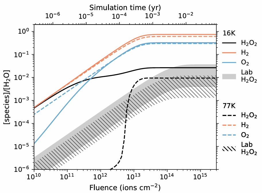 In this paper, we simulate the radiolysis experiments of pure H2O and O2 ice irradiated by protons with the Nautilus code. By tuning the parameters in the model, we can reproduce the steady state abundance ratios H2O2/H2O and O3/O2. But still there are many uncertainties.